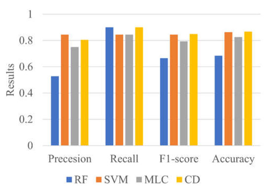 The performance of machine learning models in classifying water and non-water pixels are shown in Figure 5. Using the testing datasets of RF, SVM, MLC and CD shows a precision of 0.53, 0.85, 0.75 and 0.81 respectively, the recall values of 0.9, 0.85, 0.85 and 0.9 respectively, the F1-score is obtained as 0.67, 0.85, 0.79 and 0.85, respectively, and the accuracy is 0.69, 0.87, 0.83 and 0.87, respectively. Considering the performance metrics, the SVM and CD method achieved the highest accuracy among the four methods. Overall, our observations show that the flood pixels in Sentinel 1 images were mixed up with the pavements pixels in many places. This is the reason for the misclassification overestimation in the flood extent in many locations.