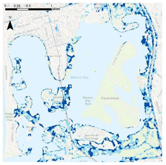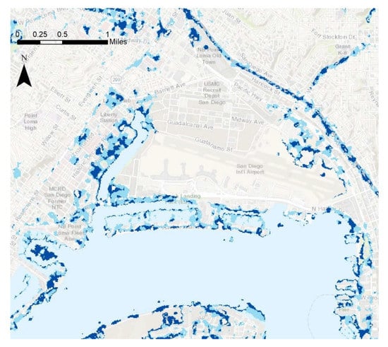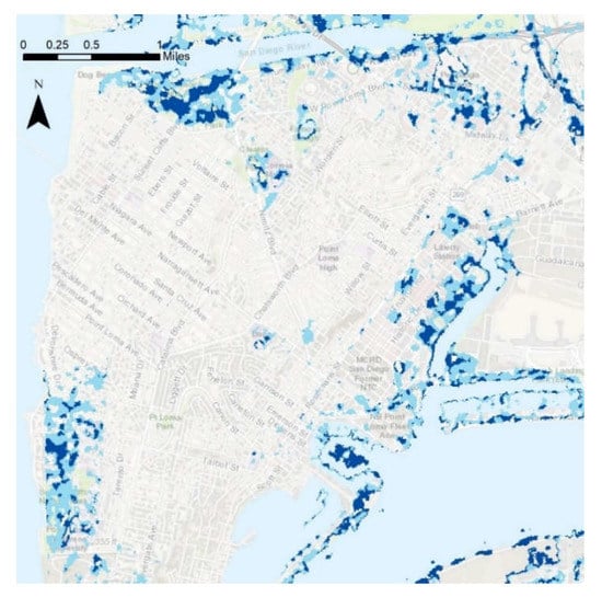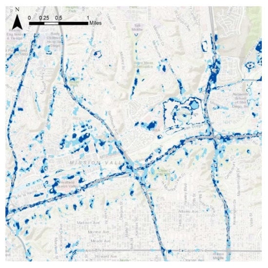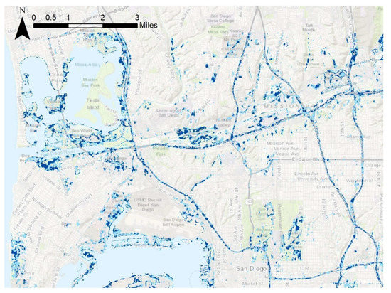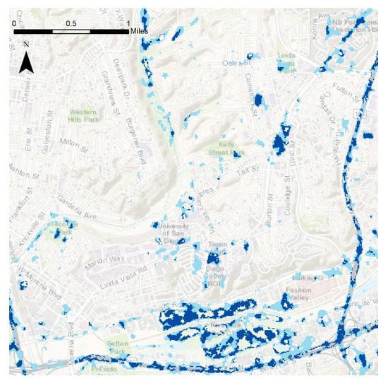 In order to identify the frequently flooded areas in our study region, Figure 9, Figure 10, Figure 11, Figure 12, Figure 13 and Figure 14 are presented based on the model with the best performance, i.e., Change Detection. Figure 9 depicts the entirety of the flood data collected throughout a coastal section of Southern San Diego County during rain events that occurred on 28 February 2017, and on 8 December 2018. Light blue shading represents areas that experienced flooding in either the 2017 or 2018 weather events, while dark blue shadings represent areas flooded by both the 2017 and 2018 weather events. As shown by the map, many instances of flooding are in close proximity to existing bodies of water such as the Pacific Ocean, the San Diego Bay, Mission Bay, and the San Diego River. Other significant flood patterns include the high coverage of San Diego’s major roads and freeways. The blue shading along the lines of Interstates 8, 805, 15 and other roadways indicates potentially hazardous road conditions or possible roadway closures. Subareas of particular interest include Mission Valley, Point Loma, Downtown, Mission Bay, and Fashion Valley. These areas highlight the use of flood detection for reducing risk through each of their unique facilities that can be affected by flooding events.