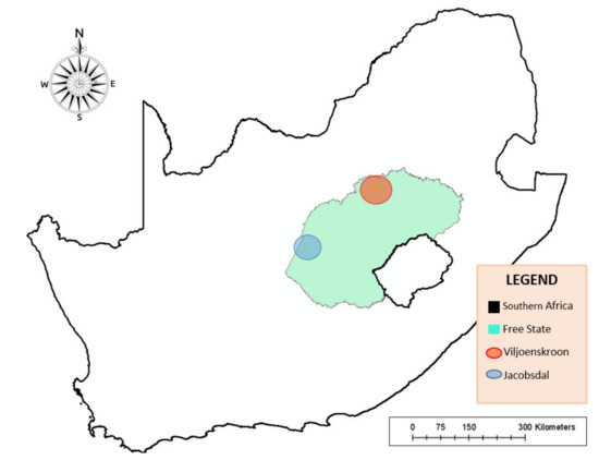 For rain-fed sunflower, the research was conducted at the Huntersvlei farm in Viljoenskroon. The Huntersvlei farm that was used as a case study was selected because it is one of the main sunflower-producing farms in the province and has been farming for over 100 years. Moreover, the data against which the WF assessment can be conducted, were available. The Orange Riet Irrigation Scheme used as the study location for irrigated sunflower sources its water from the Orange River and the Riet River. Figure 1 is a map showing the location of the study area in the Free State Province of South Africa. The Orange Riet Irrigation Scheme is represented by Jacobsdal in Figure 1. Jacobsdal is a town nearest to the irrigation scheme.