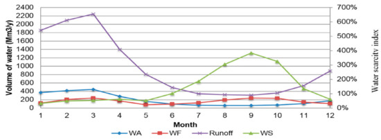 The results from the blue water scarcity assessment in the Orange River Basin are presented in Figure 3. A blue water scarcity index (WS) was calculated for the different months of the year, starting with January (#1), and ending with December (#12). WS is the ratio of WF (the total volume of water that was consumed in the basin through all of the different uses of blue water) to WA (water availability that was calculated as 20% of the natural runoff).