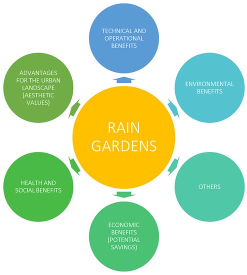 Implementing blue–green infrastructure solutions into urban tissue is associated with a number of benefits to the urban environment. It is no different in the case of rain gardens. They should be classified as multifunctional solutions. There are technical, operational, and ecological benefits, as well as social and health profits resulting from the use of rain gardens in the city. Their aesthetic qualities (as well as potential financial savings) can be added, but open space must be available. It is important to consider all of the benefits of using them when considering the various options, when making decisions concerning the planning of a city, and in city spatial management. Therefore, it is important to take a holistic approach to this issue. Figure 1 shows a diagram that illustrates the comprehensive approach to the benefits of implementing rain gardens in a city. A similar approach to profits from stormwater infrastructure was adopted in one of the tools of the American Environmental Protection Agency []. This stormwater online tool (named CLASIC) as part of its output provides information about performance (volume reduction and pollutant load reduction), and assesses the value of co-benefits, regarding the environmental, social, and financial gains [].