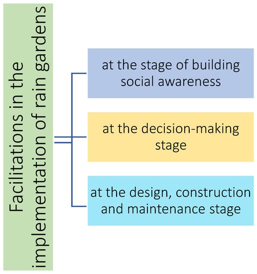 The above-mentioned facilitation forms can be used successfully at the stage of building awareness in society (regarding the need for blue–green infrastructure solutions) and at the stage of making decisions (when implementing a rain garden), as well as during the design, construction, and maintenance of the introduced bioretention system.