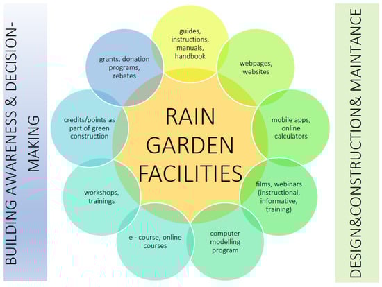 In view of the inconveniences when implementing rain gardens into urban tissue, as discussed in the previous section, there are many amenities and facilities aimed at increasing the application of rain gardens in an urban space. While the advantages and disadvantages of rain gardens are often discussed, this does not apply to a comprehensive approach to the amenities offered and created for the spread of this type of investment. All activities and tools facilitating the design, construction, and maintenance of a rain garden (including the decision to set up a rain garden by the owner himself) have been classified as facilities. Actions and tools to facilitate the implementation of rain gardens can be classified in various ways. Due to the stage of the investment, these facilities can be divided into two types: 1) facilitating the decision-making by a potential investor, i.e., the owner of the property, and 2) facilitating the design, implementation, and maintenance. What is also important is broadly understood education aimed at building awareness of climate changes in society and the need to adapt to them, which is necessary for every citizen. Such activities often start in kindergarten. For this reason, a third type exists—starting at the very beginning of an informative nature, often bringing tangible results in a much longer time perspective. These activities prepare the groundwork for future decisions on the use of rain gardens. Figure 2 presents the types of facilitations in the implementation of such solutions in cities, due to the current stage of creating a garden. Taking into account the form of the occurrence of a given facility, another classification can be introduced. The most important amenity forms include: