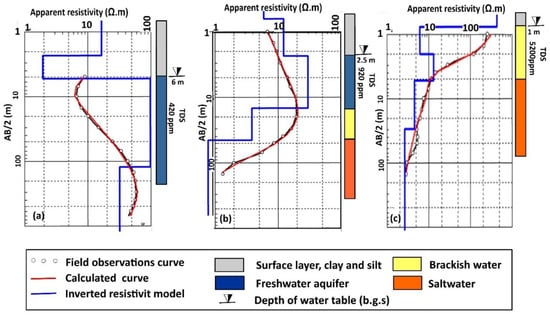- Gemail, K.; Samir, A.; Oelsner, C.; Mousa, S.; Ibrahim, S. Study of saltwater intrusion using 1D, 2D and 3D resistivity surveys in the coastal depressions at the eastern part of Matruh area, Egypt. Near Surf. Geophys. 2004, 2, 103–109. [Google Scholar] [CrossRef]