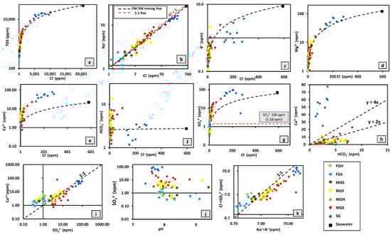- Sunkari, E.D.; Abu, M.; Zango, M.S. Geochemical evolution and tracing of groundwater salinization using different ionic ratios, multivariate statistical and geochemical modeling approaches in a typical semi-arid basin. J. Contam. Hydrol. 2021, 236, 103742. [Google Scholar] [CrossRef]