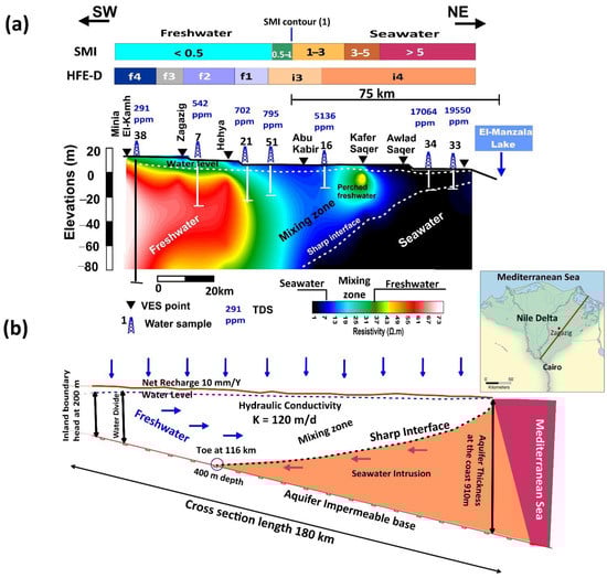 - Attwa, M.; Gemail, K.S.; Eleraki, M. Use of salinity and resistivity measurements to study the coastal aquifer salinization in a semi-arid region: A case study in northeast Nile Delta, Egypt. Environ. Earth Sci. 2016, 75, 784. [Google Scholar] [CrossRef]