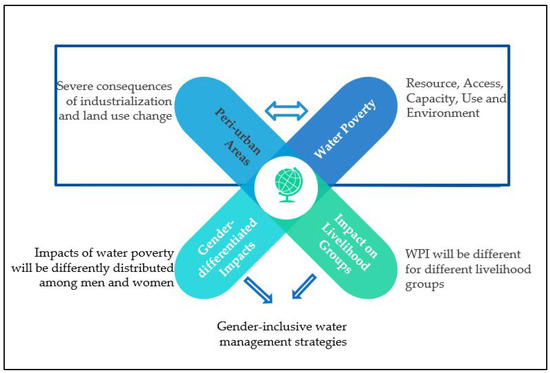 Peri-urban residents differ in their adaptive capacity as well as resilience, which is shaped in large part by their ability to mobilize social relationships, access to urban assets, linkages with the urban centers, and access to technologies. Peri-urban spaces face unique water governance challenges too [32]. They are also marked by environmental degradation, marginalization, lack of services and regulation, informality and illegality. Basic service infrastructure groans under the pressures of peri-urban population growth. Socioeconomic heterogeneity of the peri-urban interface often leads to conflict between different groups. It is thus a challenge for most citizens to access safe and secure water [33]. Both rural and urban authorities often fail to address the needs of peri-urban communities. The most prevalent water-related challenges for peri-urban residents are water pollution due to industrial and domestic waste with the presence of iron, arsenic and manganese in water, encroachment of water bodies, and finally lack of institutions and actors in the water sector. Considering these issues, it is more challenging to ensure safe water for poor peri-urban settlements. All these water-related issues lead the peri-urban poor settlements towards water poverty. Hence, these issues need increased academic attention and acknowledgement in policy making to eradicate water poverty and ensure water sustainability. Also, acknowledging these water-related issues in the peri-urban context from a gendered lens is important to investigate the impacts of water poverty.