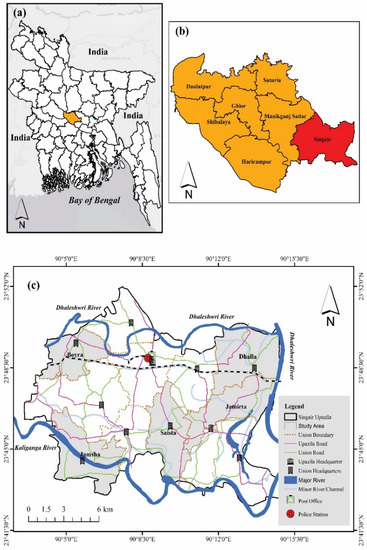 Location of the study area: (a) Manikganj district in Bangladesh; (b) Singair Upazila in Manikganj; and (c) selected unions in Singair.