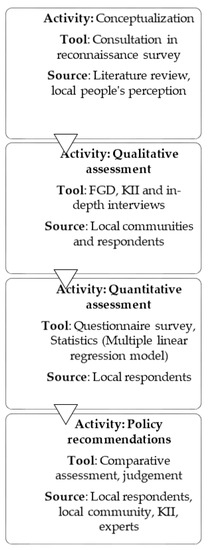 To evaluate the gender-differentiated impact of water poverty, this study followed a mixed method approach (Figure 3). Gender inequalities in the study area, due to the exacerbating water situation and peri-urban features, were identified by reviewing relevant literature and conducting reconnaissance surveys. Then, a qualitative evaluation was conducted through FGDs, KIIs and in-depth interviews with local communities, administrative officials and experts in order to portray gender-differentiated impacts in the water poverty framework. A quantitative analysis was done through a questionnaire survey to establish the overall comparative water poverty situation and to validate the qualitative results. Finally, some policy suggestions were made, based on the findings and experiences gained during the study.