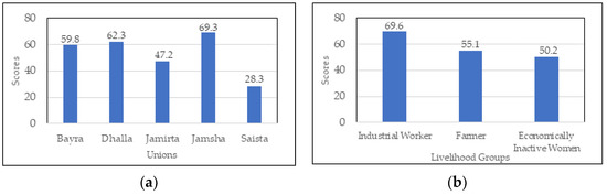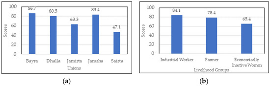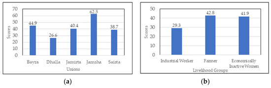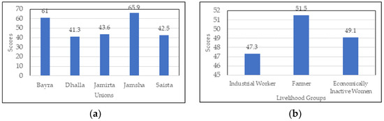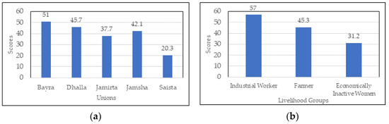 Score of access component for: (a) 5 unions; and (b) livelihood groups.