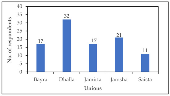 Primary data was collected from 5 unions. The major disadvantaged livelihood groups, namely industrial workers (male and female), farmers (male and female) and economically inactive women, were the target groups. Workers who are currently working in garment factories, steel industries, and washing plants, with monthly average incomes less than US$100, were considered as respondents for the industrial worker group. The industrial worker group was sourced only from Dhalla union, as other unions did not have sufficient respondents from this group. In the farmer group, small-scale male farmers (0.02–1.00 ha of personal land, and also agricultural laborers working on others’ farms) [50] and women involved directly in farm activities (seeding, weeding, post harvesting) or indirectly (cooking or carrying lunch on the farms for the workers) were considered. The economically inactive women group consists of unemployed women, adolescent girls, physically challenged and elderly women who are not involved in any kind of economic activities. Adolescent girls are in the age group of 10 to 19 years [55,56] and elderly women are aged 60 years and above [7].