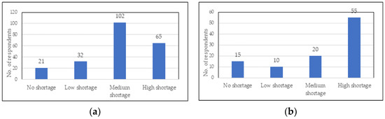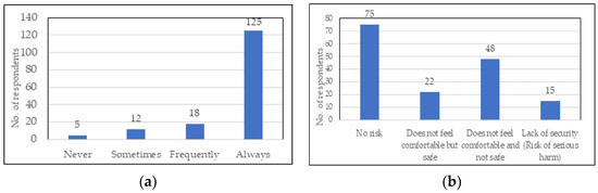 The majority of the female respondents reported that they had to collect water even when they were sick. 125 out of 160 female respondents stated that the collection of water was mandatory for them in any circumstance. Only 5 respondents had supporting family members who helped them in collecting water in case of illness (Figure 7a). Another finding indicated that 15 respondents who collected water for their families faced security issues during the collection of water (Figure 7b). Even after facing such issues and sharing these issues with their families, they still had to collect water. These societal and family situations and practices caused a serious gender-differentiated impact on poor accessibility to water.