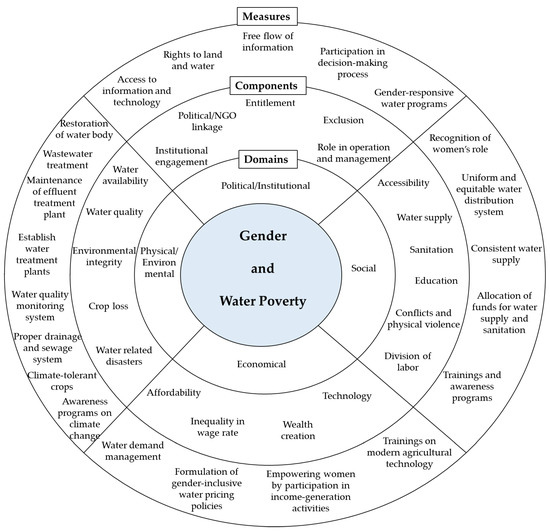 For gender-inclusive water management, all these components and their associated indicators were further grouped into four categories: namely, physical or environmental, economic, social and political. The Resource and Environment components were combined under the physical domain. The indicators of the Capacity component were divided into two domains: namely, economic and political. The indicators of the Access and Use components fell under the social domain. All these domains were helpful in suggesting potential measures for improving the water poverty situation by following gender-inclusive water management. Figure 1 represents the conceptual framework of this study.