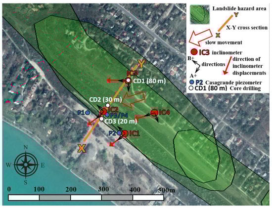 Figure 3 shows a site plan of the area, on which the information from the Hungarian Surface Movement Cadastre [30] is also displayed. There are three landslide-hazard areas overlapping in the study area according to this map [30]. The largest polygon indicates rotational landslide, where collapse occurs as a result of complex natural process. A shoreline-protection system was built to eliminate wave erosion. It has reduced the movements since 1979 and therefore, the area was temporarily stabilzed. The other two polygons both indicate occasionally rotational landslides. One million cubic meters of earthworks have been carried out to eliminate the movements. The railway track has been modified; it was moved 30 m towards the hill, and a 90 m-long tunnel was built for safety reasons. A surface drainage system was also constructed and a stone-paved surface was created. Thus, while the condition of the smaller zone is already settled, the location of the larger polygon is still moving according to measurements. The movements continued into the 21st century: In May 2010, the railway track was affected by a 70 m-wide slip and a collapse occurred. In March 2011, a 100 m-long slump occurred, and the railway section was restored by piles and ground improvement by injection. In 2014, a gabion retaining wall was built to support one of the streets. In 2017, 200–300 m3 of soil slipped due to irregular rainwater drainage. The recent movements signify the vulnerability of the slope. The hydrogeology is unique since the hinterland feeds groundwater; additionally, there is a complex interaction of lower horizons of groundwater with lake water. The lake level has been fluctuating in ten meters of amplitude according to the records of the past 500 years. The groundwater table has an indirect link with precipitation. These conditions lead to the presence of confined aquifers that reduce slope stability. A monitoring system is in operation, including groundwater-monitoring wells (Casagrande piezometers) and inclinometers (Figure 3).