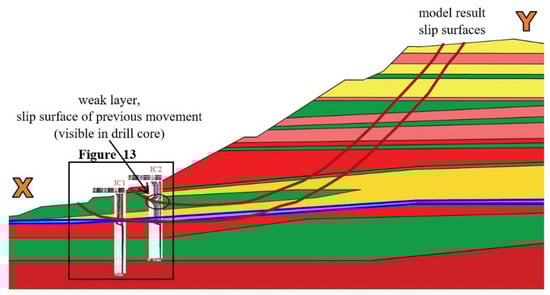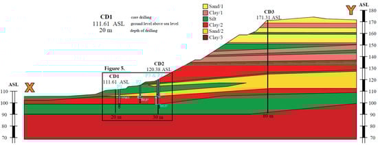 The geometry of the modeled section was constructed from three boreholes, as shown in Figure 4. A borehole was drilled to a depth of 80 m at the top of the bank and at 30 m and 20 m into the slope. Additional data sources were also used: core drillings of the larger area of ~400 m × 800 m were taken into account in the model’s construction. The geomorphological evolution of the site is unique since the lakeside has retreated due to several phases of sliding. The area and section can be morphologically divided into four parts: foot slope, debris slope (formed by previous movements), slope (with a cut-in railway line) and convex slope. There are hardly any parallel layers or uniform layering due to historical and recent slides which have disturbed the original geological structure [22]. This factor complicates the geotechnical–soil-mechanical correlation and the representation of reality in geotechnical software, but this is not the only reason why the model needs to be simplified. The presence of many very thin layers that are difficult to handle in the slope-section modeling is an additional reason for the simplification. Even with these factors, the result was a rather complex section, with nineteen layers instead of the nine used in previous studies [44,45,46].