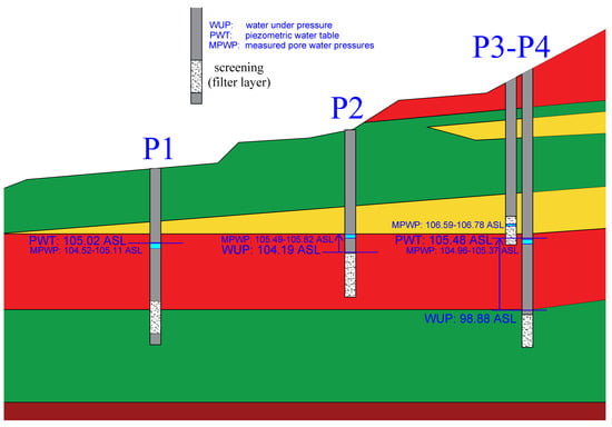 Casagrande piezometers (P1–P4) with measured water levels (legend: WUP—water under pressure, i.e., the level where water was first detected at the time of drilling; PWT—piezometric water table; and MPWP—measured pore water pressures).