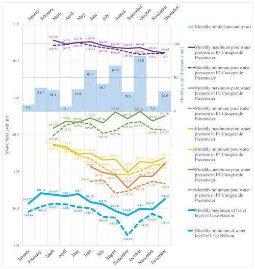 The four piezometers were installed in different layers (Figure 5). The monthly minimum and maximum values of the measurements (recordings every three days) for each well are shown in Figure 7. The water level of Lake Balaton is also indicated by monthly minimum and maximum values with a thick blue line, while the blue bars represent the monthly rainfall.