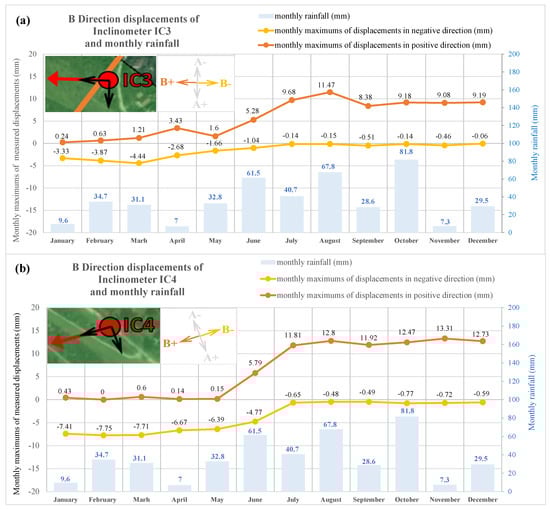 Graphs of monthly maximum displacements measured by inclinometers and monthly rainfall (a) B direction displacements of inclinometer IC3 and monthly rainfall (b) B direction displacements of inclinometer IC4 and monthly rainfall.