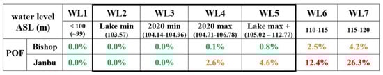 Probability of failure (POF) by Bishop and Janbu simplified methods for different modeled water levels.