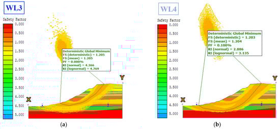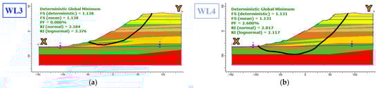 Janbu simplified, complex shaped slides from Rocscience Slide2 software. (a) Results for WL3 modeled water level, considering the minimum values of water levels measured in 2020; (b) Results for WL4 modeled water level, taking into account the maximum values of water levels measured in 2020.