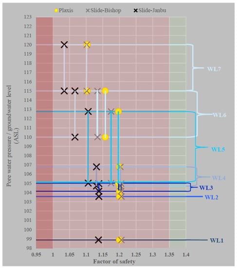 Slide2 models of the WL4 water level, with their deep circular slides, have been recorded using the geometric conditions given in a previous study [22]. In this paper, three methods were used to calculate the factor of safety, as a function of the modeled water level (Figure 12). The safety factor at lower water levels (WL1, WL2, WL3) is only around 1.2, which is less than the Eurocode value of 1.35 (green zone in Figure 12), but based on the probability calculations, we should not expect a failure at this level. However, the 2020 maximum water level and pore water pressure (WL4) could be a notification level, as the risk of movements is expected to increase rapidly as water levels continue to rise. The probabilistic calculations showed many more possible slip geometries than in the Plaxis software and the value of the factor of safety was lower in all cases by Slide2.