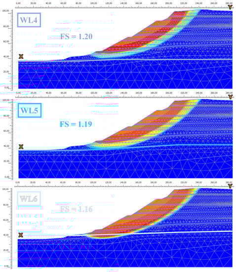 In the Plaxis software, the safety factor began to decrease only with the extreme water-level rise (WL6, WL7). The colors of the maximum displacement plots (Figure 13) indicate the amount of displacement: the dark blue areas indicate zero displacement, and the red areas show the maximum displacements at the time of failure. The typical rotational landslide movement of the high banks of Lake Balaton now has two slump blocks shown on the Plaxis result graphs: a red main body, and a slimmer, deeper block, the displacement of which increases with the water level: WL1–L4—light blue, WL5—yellow and finally WL6 and WL7—red zone.