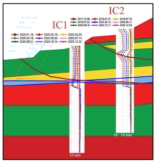 Displacements of IC1 and IC2 inclinometers with soil layers and sliding surfaces of the model result.