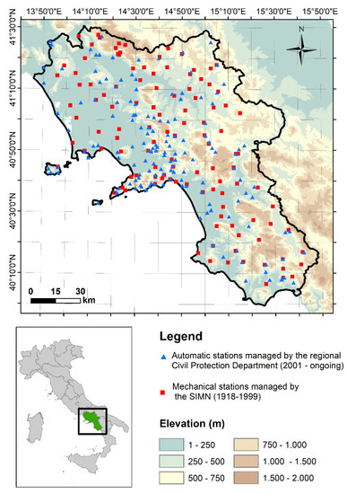 Currently, there are about 160 automatic stations in Campania operated by the regional Civil Protection Department, with a mean coverage of about one station per 90 km2. However, the density of the network is quite uneven over the region (Figure 1). All of the new automatic stations show a record length of at least nine years. The acquisition of the rainfall data is made by automatic pluviometers providing collections of precipitation measures directly in digital format [10], with a time resolution of 10 min.
