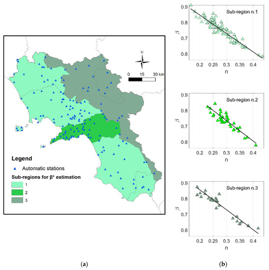 Three main subregions were identified based on a cluster analysis used to optimize the correlation between and . These regions are shown in Figure 2a, along with the automatic stations used for the analysis. The individuation of clusters started from the homogeneous subregions of rainfall extremes as part of the above-mentioned VAPI project [19]. The central part of the Campania region is characterized by the presence of orographic barriers (Figure 1) that divide the two coastal subregions (n.1-2) and the inner subregion (n.3). Subregion n.2, unlike the other coastal sub-region (n.1), is characterized by a complex topography with characteristic exposure to the wet air masses that predominantly arrive from the SW-NE direction (Figure 1) [35].