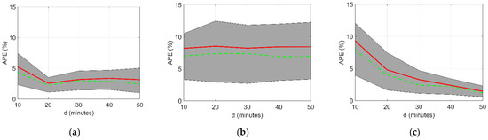 Figure 3 shows the performances of the new hybrid regional procedure (Figure 3c) compared with those of the best approach (Figure 3a) and kriging assessment (Figure 3b) for estimating the mean annual maximum rainfall at sub-hourly durations. The performance variability among the 160 automatic stations available in the region is presented in Figure 3 through the grey area, representing the values between the 25th and 75th percentiles of the absolute percentage errors at each duration. The mean and median absolute percentage errors at each duration are shown with red and green lines, respectively. The 75th percentiles of the APE related to the hybrid regional procedure are always lower than 12%, with a peak reached at 10 min, while the 75th percentiles of the APE of the kriging interpolation present a constant pattern, with a peak value of 12.5% at 20 min. The best estimates corresponding to 10 min show maximum 75th percentiles of APE across the region equal to 7.5%. The mean values of the APE of the hybrid regional estimates across the region range from 9.3% at 10 min to 1.65% at 50 min; the same quantities for the kriging estimates remain essentially constant along the durations and equal to 8.5%. As concerns the best estimates, the mean values along the region of the APE range from 5.2% at 10 min to 2.6% at 20 min.
