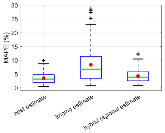 Figure 4 presents a summary of the performances averaged across all durations for the three considered approaches. The mean regional MAPE at sub-hourly durations varies from 3.5% for the best estimate to 8.4% for the kriging estimate. The hybrid regional procedure shows a mean regional MAPE at sub-hourly durations equal to 4.3%, very close to that of the best estimate and almost half that of the alternative approach.