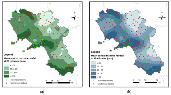 Maps of the mean annual rainfall maxima at (a) 20 min and (b) 40 min. The maps were obtained by interpolating observed data from both the automatic stations belonging to the newest network and from mechanical stations belonging to the historical network, then computed using the proposed hybrid regional procedure.