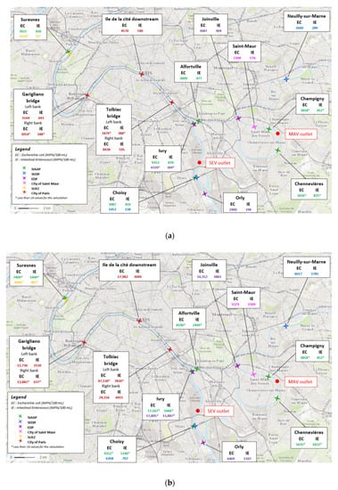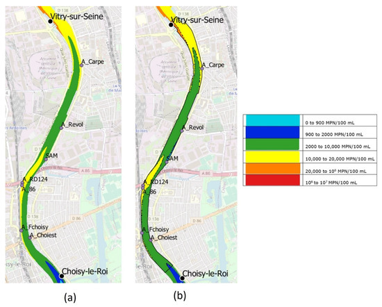 - Mouchel, J.-M.; Colina-Moreno, I.; Kasmi, N. Evaluation des Teneurs en Bactéries Indicatrices Fécales en Seine dans L’agglomération Parisienne par Temps Sec; PIREN-Seine: Paris, France, 2018. [Google Scholar]