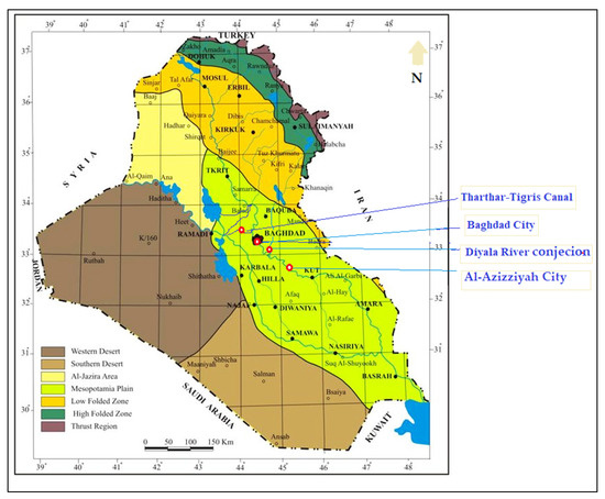 The selected area extends from Tharthar-Tigris Canal which is located in the north part of Baghdad city to Al-Azizziyah city in the south of Baghdad city near Kut government within the following geographical coordinates ranges (33°55′07″–32°54′30″ N and 44°22′16″–45°4′0″ E), (Figure 1).