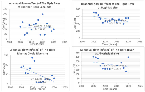 Annual flow (m3/s) of the Tigris River for the period (1990–2020), (A) annual flow (m3/s) of Tharthar-Tigris canal, (B) annual flow (m3/s) for Baghdad site, (C) annual flow (m3/s) for Diyala River, and (D) annual flow (m3/s) for Al-Azizziyah site [35].