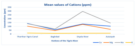 Mean values of annual cations (ppm) along the Tigris River for the period (2005–2020) [26].