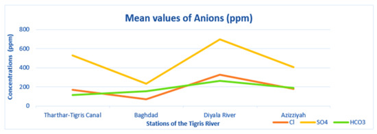 Mean values of annual antions (ppm) along the Tigris River. For the period (2005–2020) [26].