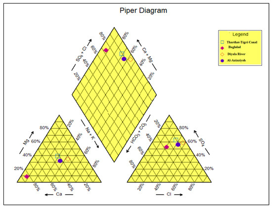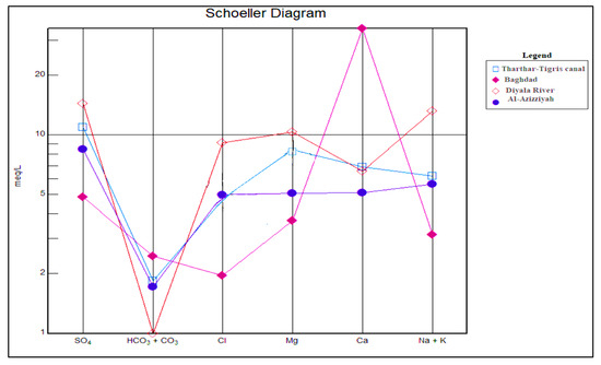 Schoeller diagrams are also used to show the relative concentrations of anions and cations typically expressed in milliequivalents per liter [44]. based on the average values of hydrochemical parameters of the Tigris River. At the Tharthar-Tigris Canal site, the cations are in the order of abundance as Mg2+ > Ca2+ > Na+ > K+ while the anions reveal an order of abundance as SO42− > Cl− > HCO3−. While, at the Baghdad site, the cations are in the order of abundance as Ca2+ >Mg2+ > Na+ > K+ while the anions reveal an order of abundance as SO42− > HCO3− > Cl−. At the Diyala River site the cations are in the order of abundance as Na+ > Mg2+ > Ca2+ > K+ while the anions reveal an order of abundance as SO42− > Cl− > HCO3−. Finally, at the Al-Azizziyah site, the cations are in the order of abundance as Na+ > Ca2+ > Mg2+ > K+ while the anions reveal an order of abundance as SO42− > Cl− >HCO3− (Figure 7). The Al-Azizziyah site (south of Baghdad city), is believed to represent the total mixing of all the above sites water.