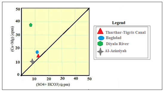 The graphic relation of Ca2+ + Mg2+ versus SO42− + HCO3− is close to the 1:1 line as normal case if the dissolutions of calcite, dolomite, and gypsum are the dominant reactions in the water [49,50]. The points are shifted to the left due to a large excess of calcium and magnesium relative to sulfates and bicarbonates. The reverse is true when the ion exchange tends to shift points to the right due to an excess of SO42− + HCO3−.The sites of the Tigris River are shifted relatively to the left as a result of calcium and magnesium excess relative to sulfates and bicarbonates (Figure 8).