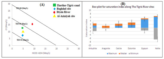 Phreeqc software [51] was used to assess the saturation indices for the Tigris River path. The results are shown in the boxplot (Figure 9B). For the Tharthar-Tigris Canal SI-gypsum, SI-anhydrite, and SI-halite were relatively high values, whereas, SI-calcite and SI-dolomite were above zero and in contrast SI-aragonite was negative. As for the Baghdad site, SI-calcite and SI-dolomite were higher values, SI-aragonite was above zero, and SI-gypsum, SI-anhydrite, and SI-halite were negative. For Diyala River, SI-anhydrite and SI-halite were relatively high values, SI-calcite and SI-dolomite were above zero, and SI-aragonite and SI-gypsum were negative. Finally, at the Al-Azizziyah site SI-anhydrite and SI-halite were relatively high values, SI-aragonite, SI-calcite and SI-dolomite were above zero, and (SI-gypsum) was negative. Such results confirm that some water samples are oversaturated or close to equilibrium calcite, dolomite, anhydrite, gypsum and halite in contrast to aragonite due to geological rock composition and due to reaction between water and bedrock.