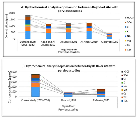 Moreover, the comparisons of this study results with previous studies shows that most of the parameters are relatively higher than the result of previous studies and these values exceeded the standard of WHO, 2018 and IQS, 2009 for drinking water [30,31,32,33,34], (Figure 11). This finding may reflect the deterioration of Tigris water with time due the climate change effects, low river discharge, and relatively high contamination within the past two decades.