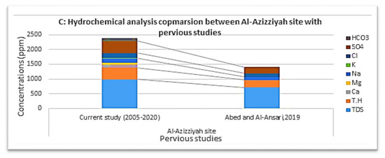 Comparison between the hydrochemical analysis of the current study data with the previous studies, (A) Baghdad site, (B) Diyala River, and (C) Al-Azizziyah site.