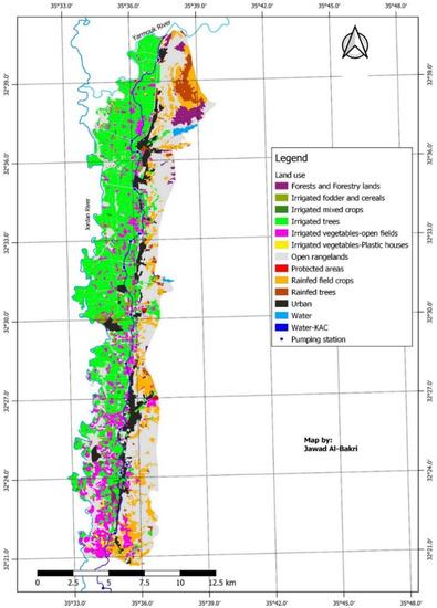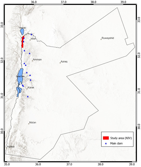 The NJV study area is located in the northwest of Jordan between 32.35 to 32.68° N and between 35.55 to 35.62° E (Figure 2), with a total area of 182 km2 and a total population of 142 thousand. The study area is located below the mean sea level (bmsl) with altitudes ranging from −200 to −300 m. Therefore, the NJV has a subtropical climate that is warm in winter and hot in summer. The average monthly minimum and maximum temperatures are 13 °C (January) and 32 °C (August), respectively. The mean annual rainfall during 1980–2019 was 391 mm. Soils in the NJV are deep and characterized by silty clay and silty clay loam textures, that originated from alluvial and colluvial parent materials that covered the layer of marl or Lisan [31]. Soil data from the JVA showed low levels of soil salinity in the NJV, where the average salinity, expressed in electrical conductivity (ECe) units, was less than 1.5 dS/m. The warm climate and the good soils have made the NJV an important agricultural area that contains most of the citrus crops grown in Jordan. In addition to citrus, irrigated farms grow crops of vegetables (tomato, okra and others), vineyards, and date palm. Rainfed cultivation of cereals and olives is practiced in the eastern parts of the NJV.