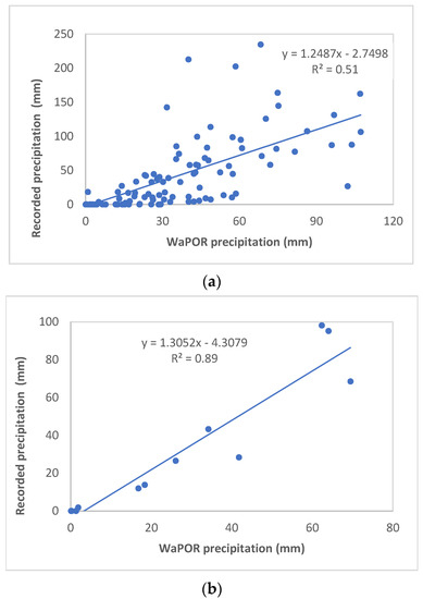 Relationships between WaPOR precipitation and rainfall records for Baqoura Station. (a) Monthly data of 2009–2019; (b) average value during 2009–2019.