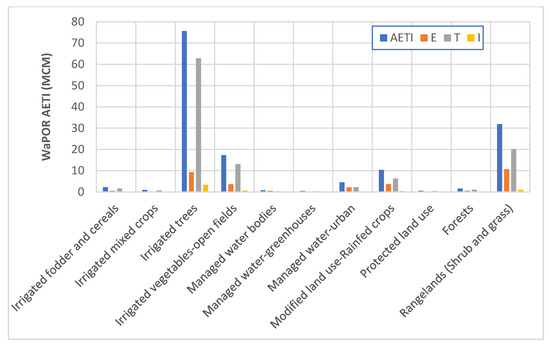 The main outflow in the NJV was the AETI from irrigated and rainfed areas, followed by the interbasin transfer (Table 4). The estimated runoff in this agricultural area was 3.4 MCM, which accounted for 2.3% of the total outflows. Detailed analysis of AETI from WaPOR data showed that managed water use constituted 70% of the AETI outflows, as summarized in Figure 5. The data of WaPOR, which were summarized for each water-use category using different GIS functions, showed that irrigated areas contributed to 66% of the total AETI (96 MCM out of 146 MCM), while rainfed areas and rangelands contributed to 30% of the total AETI.