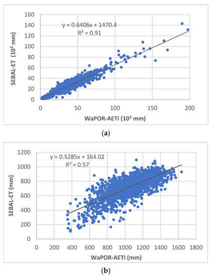 Relationships between WaPOR and SEBAL annual ET in the NJV using the sum of ET for farm units (a) and ET at the level of WaPOR’s pixel (b).