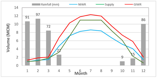 Calculations of ETc for irrigated farms showed that the NIWR and GIWR for irrigated areas in the NJV were 58.2 and 83.1 MCM, respectively. The total amounts delivered to these areas were 69 MCM, with an obvious gap between supply and demand (Figure 7). The calculations of ETc using climatic data and Kc values for the NJV showed that SEBAL provided better estimates of ET than WaPOR. In terms of water deficiency, the gap between supply and demand was observed throughout the year, indicating the problem of water deficiency in the NJV. The deficit in year 2019 was 16%, which was less than the average deficiency of 20–25% adopted by the JVA for water distribution to farmers. This could be attributed to the relatively good rainfall season of 2019, which provided most of GIWR during December–March (Figure 7).