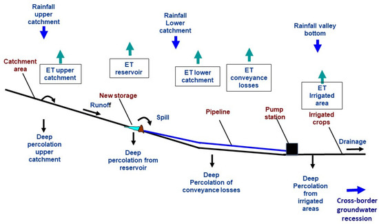 Analysis of outputs from this study provided a base for comparison among the most probable solutions to water deficiency in the NJV. These would include the augmentation of water supply through development of surface water from the side wadis or the use of groundwater volumes originated from percolated water and return flows. The study showed that both options could be adopted to overcome the problem of water deficiency in the NJV. While the emphasis in Jordan was always on developing surface water resources, the results of this study show that the shift to improved water management practices should be encouraged and should depend on outputs from the AWA. In the NJV area, the hydraulic structure of irrigation and the large irrigated area would result in large volumes of recoverable water that could be utilized. In terms of water harvesting structures, the results from the first cycle of water accounting carried out in the NJV through FAO-RNE [41] indicated that losses on the form of deep percolation would occur in all phases of the irrigation process (Figure 10). The sources of losses were mainly the open KAC and the water conveyance network. These off-farm systems’ losses could be employed to supply irrigation water in both developed and developing countries and would provide important source of water that could be reused after carrying what is known as a “hotspot assessment” of spatial water losses [55]. In Jordan, the assessments reported by previous studies [33,34] showed that the average losses from KAC in the NJV were 19% of the total annual inflow, which might emphasize the need for utilizing large part of these losses by either developing recoverable water or by replacing the open channel system with closed pipelines.