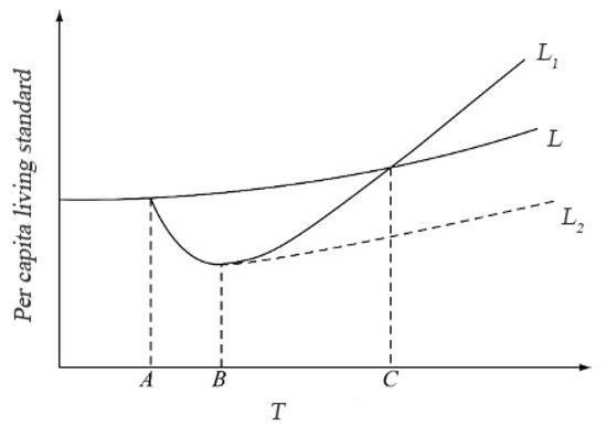 In the figure, L represents the situation in which, without relocation, the living standards of RDP can be regarded as a time series with a certain growth rate. L1 represents the situation in which, with relocation, the living standards of RDP may recover or exceed their original level through compensation, subsidies, and subsequent support. Section AB represents the relocation process, when their livelihood has been destroyed, and their living standards decline. Section BC represents the implementation of resettlement policies, when RDP gradually adapt to their new life and their living standards recover. L2 represents the case in which resettlement measures have failed, and RDP are threatened by poverty.