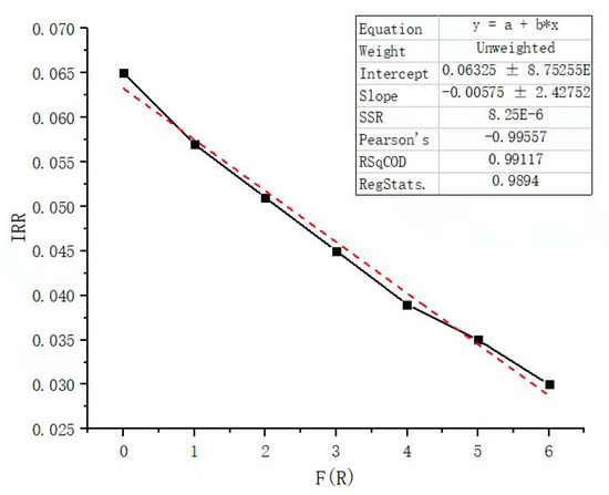 According to the contract signed for the project, the concession period will remain unchanged for 35 years. If the project is delayed by one year, the capital gains will be delayed by one year. Operating costs, business income tax, and value-added tax will also be delayed by one year, but bank loans and interest still need to be repaid according to the original repayment method. The IRR for the developers can be calculated according to the corresponding cash flow diagram. Similarly, the relationship between developers’ IRR and project delay time, , can be obtained (Figure 5). The IRR is roughly proportional to the delay time, with a linear fitting equation